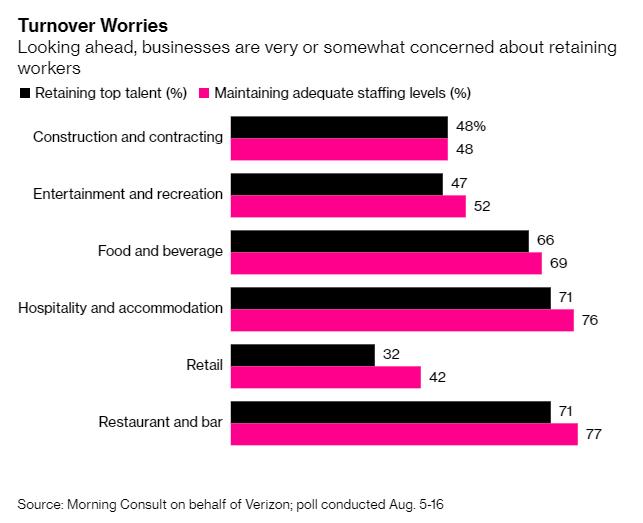 根据Morning Consult代表威瑞森通信在8月对约600家中小企业进行的民意调查显示,约70%的餐饮和酒店业受访者对留住人才感到有些或非常担忧,约一半的建筑和娱乐业受访者也是如此。
