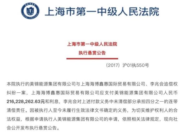 公告显示,海博鑫惠应支付美锦能源人民币2.16亿元和利息,李兆会对上述付款义务中未清偿部分承担四分之一的连带清偿责任,至今未履行生效法律文书确定的义务。
