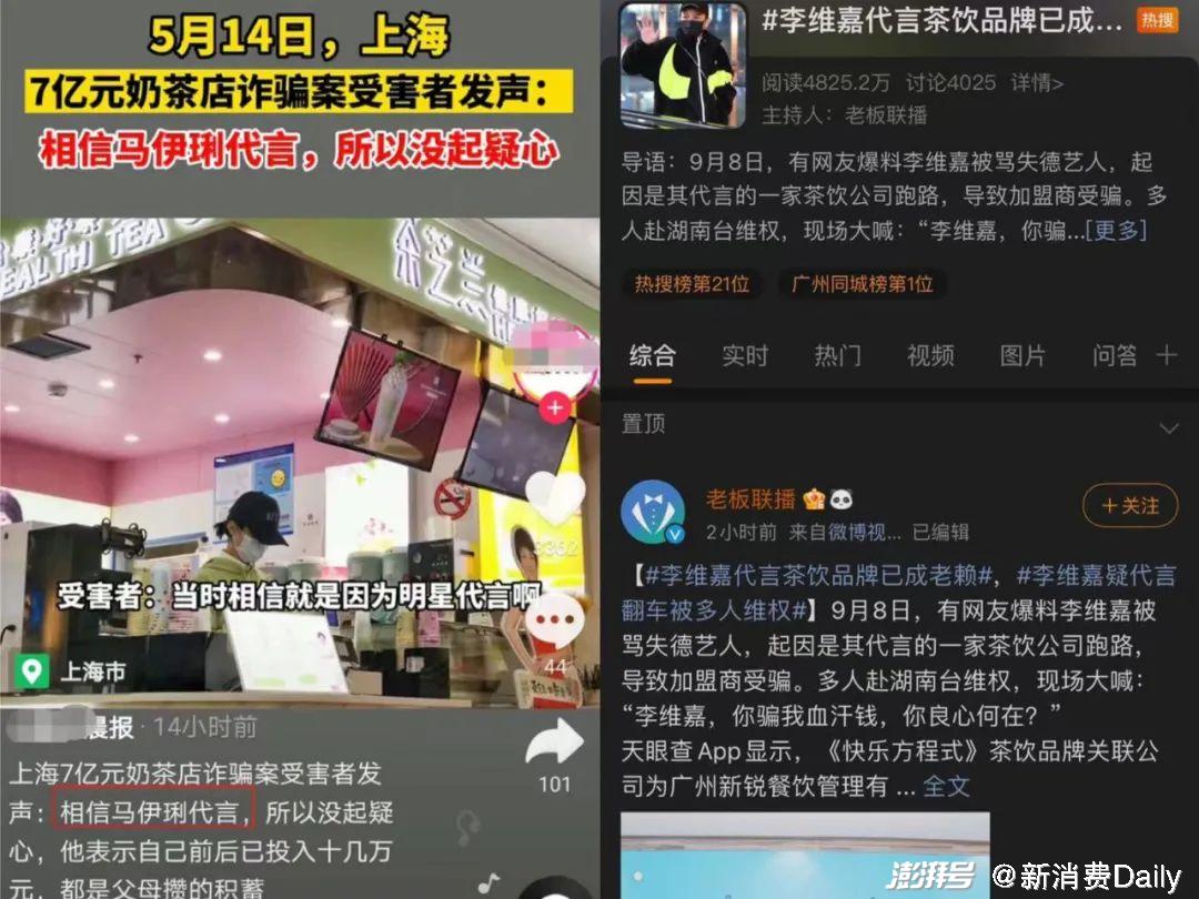 最新的一桩“惨案”就发生在本文成文过程中,9月9日,#李维嘉代言茶饮品牌已成老赖#跑上热搜。据九派新闻消息,9月8日,有网友爆料李维嘉被骂艺人失德,起因是因为其代言的一家茶饮公司跑路,导致加盟商受骗,这一品牌为“快乐方程式”。其中一位加盟商对封面新闻表示,这件事已经很久了,全国各地加盟商都在维权,有的投资150多万,去广州申请退钱,只拿到1.5万到两万元。如果将时间线再次前调至今年5月,马伊琍代言的茶饮品牌“茶芝兰”同样涉嫌加盟加盟诈骗。