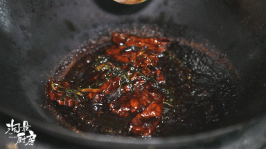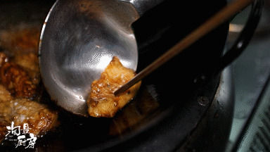倒入煎好的大排,加入1调羹(15ml)黄酒、1调羹(15ml)生抽、1.5调羹(15g)糖和1调羹(15ml)老抽调味。