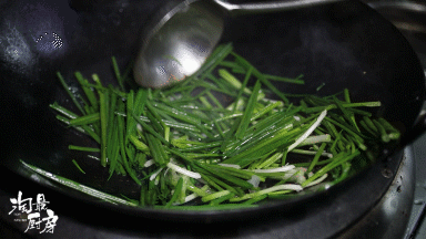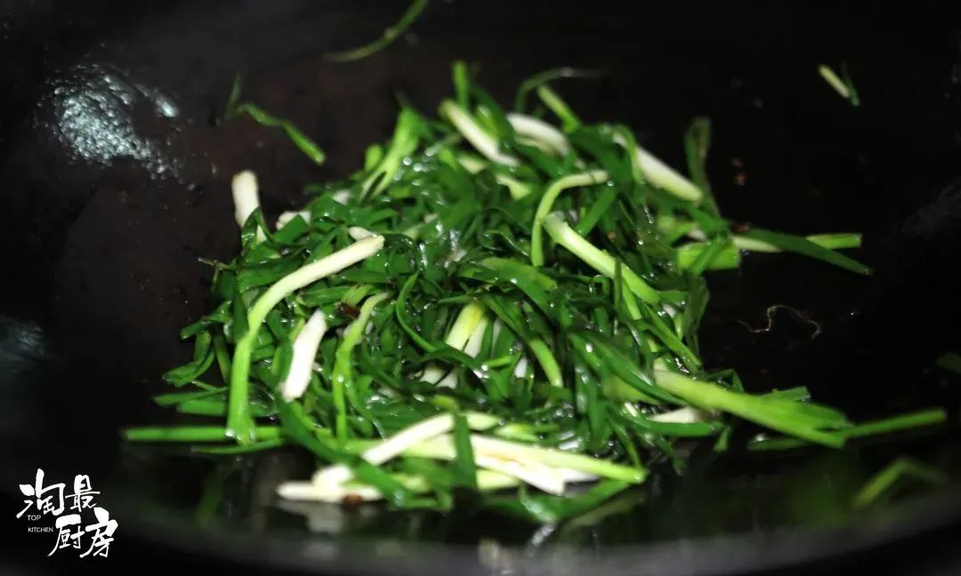 锅热倒入3调羹(45ml)油,开中火,下葱段翻炒。