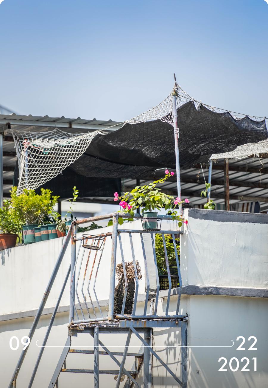 她指向邻居家的天台,四户人家修了空中铁栈桥通向这阳台,阳台上有张麻将桌,嘿,这凑角可真方便。
