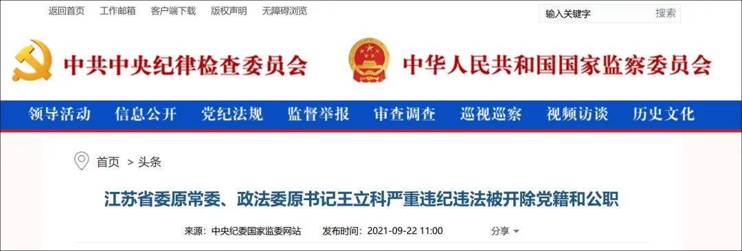 据中央纪委国家监委网站22日消息,日前,经中共中央批准,中央纪委国家监委对江苏省委原常委、政法委原书记王立科严重违纪违法问题进行了立案审查调查。