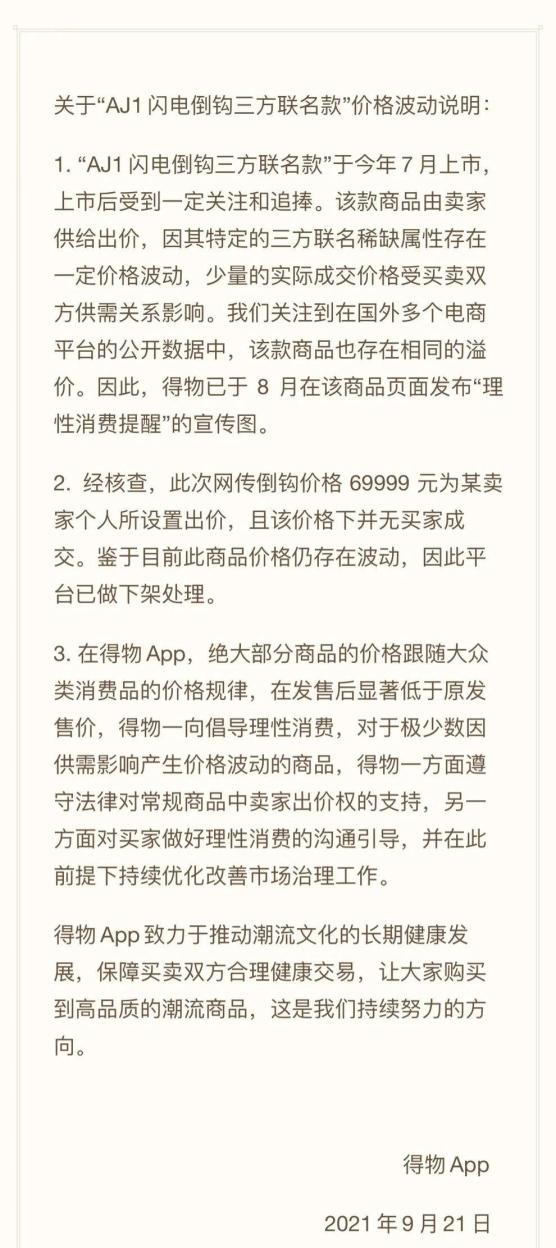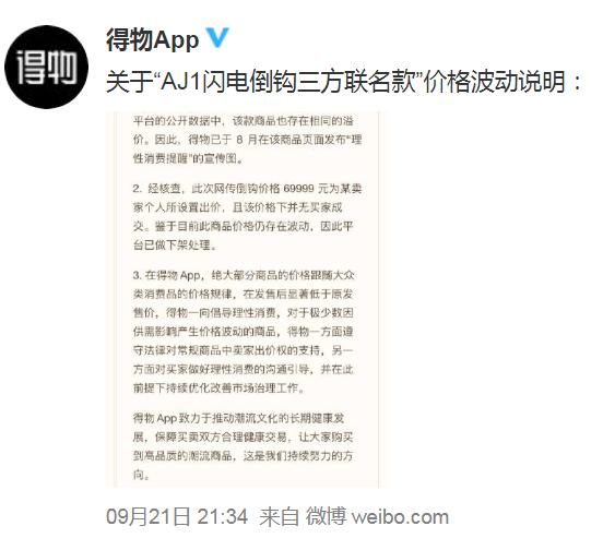 9月21日晚,得物App官方微博发布《关于“AJ1闪电倒钩三方联名款”价格波动说明》。