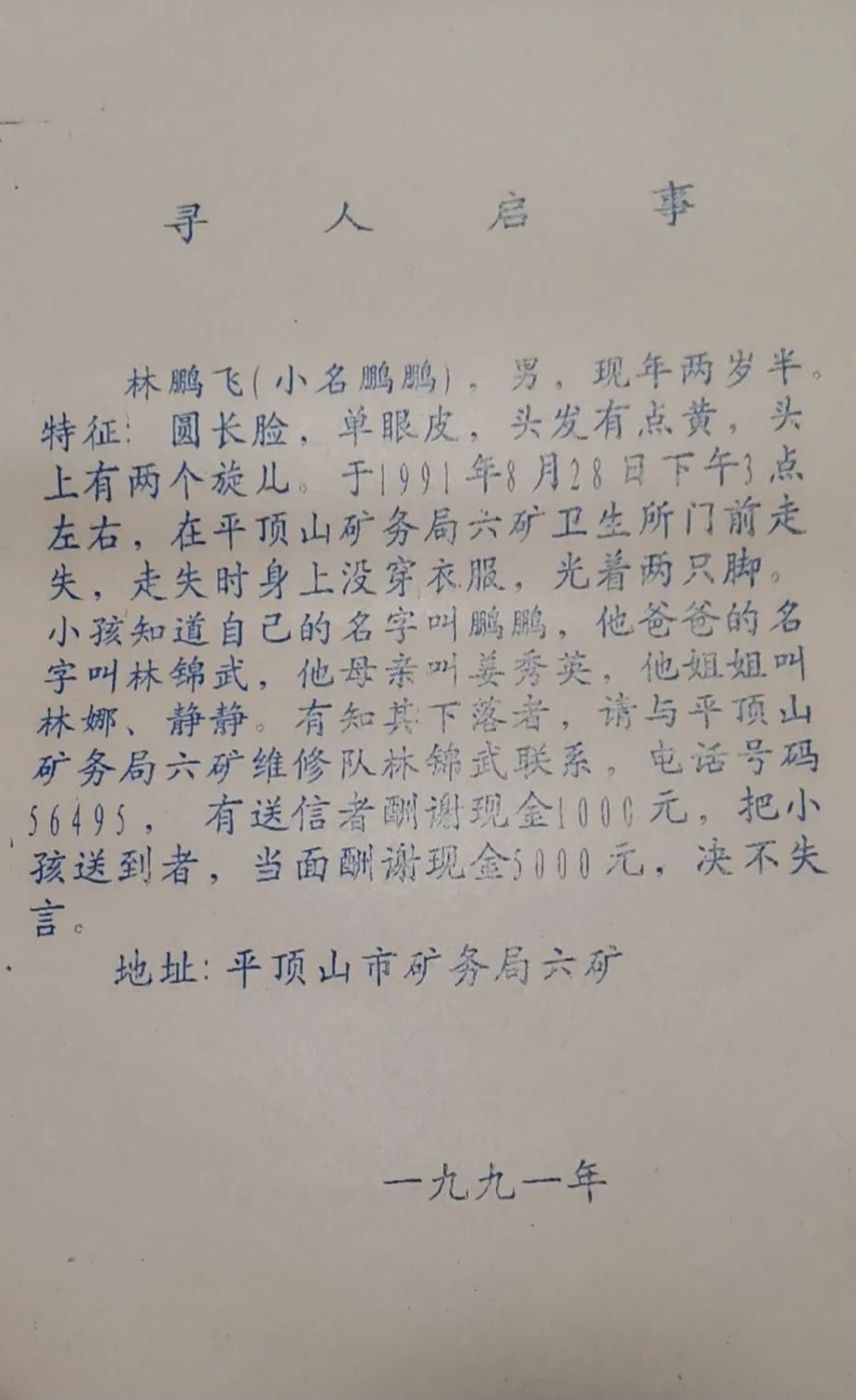 家住河南省平顶山市的林锦武,是平煤神马集团六矿退休职工,今年60岁。1991年8月28日中午,林锦武在床上和2岁半的儿子林鹏飞一起午休,醒来后,发现儿子不见了。