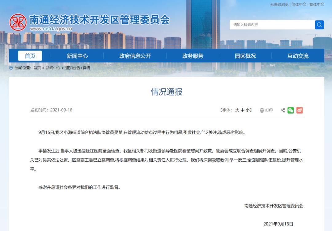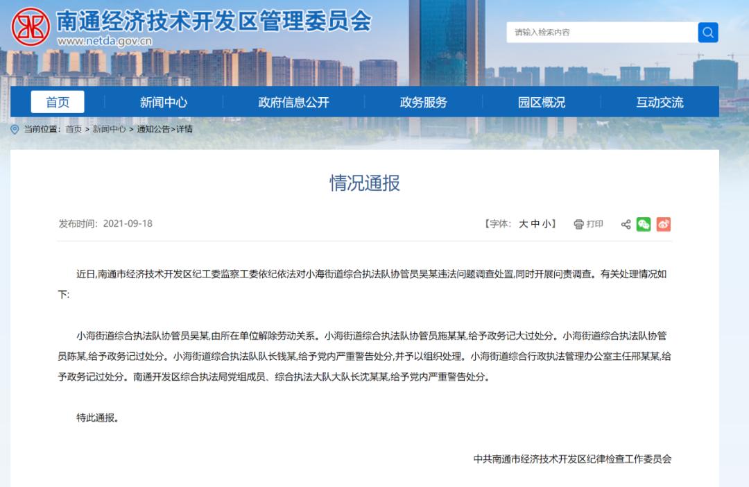 9月18日晚,南通市委宣传部通报: “拎摔卖菜老太”协管员解除劳动关系,所在街道及南通开发区综合执法局多人受处分。