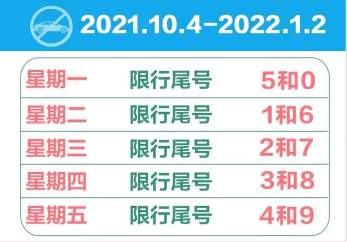 (三)自2021年10月4日至2022年1月2日,星期一至星期五限行机动车车牌尾号分别为:5和0、1和6、2和7、3和8、4和9;