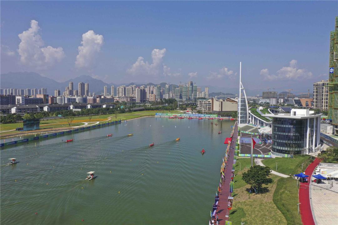 决赛场地温州龙舟运动中心,是2022杭州亚运会龙舟比赛项目场地,位于瓯海中心区,总用地面积532亩,由建筑、景观和水上三部分组成,建有潜龙阁、观龙台、终点塔等建筑设施,水上赛道长1200米、宽130米、水深3.5米,是国际标准的专业顶级龙舟赛场。