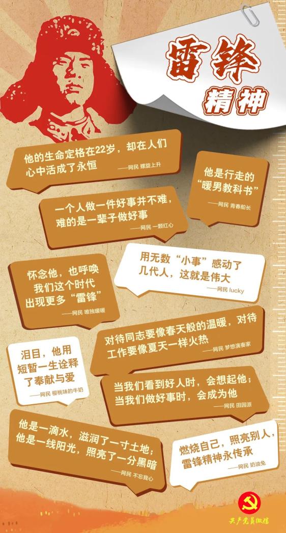 学习雷锋好榜样。从城市社区到偏远山乡,多少人执着坚守、默默奉献,用自己的光与热温暖别人,赓续着永不褪色的雷锋精神。赠人玫瑰,手有余香。搭把手、出份力,做一颗永不生锈的螺丝钉,每一个平凡英雄,都是这个美好人间的一抹亮色。