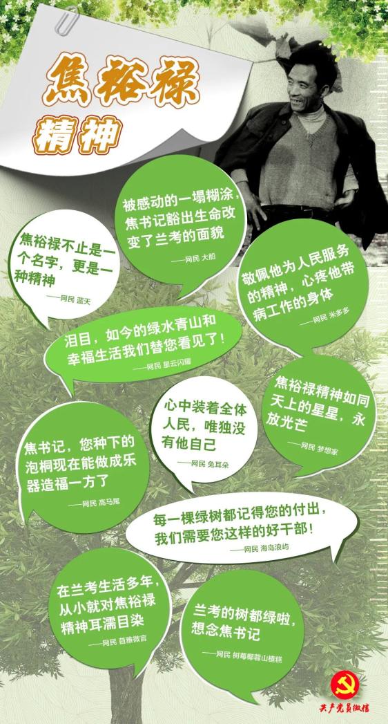 青山苍翠、淄水奔流。焦裕禄的精神如家乡的大山、如兰考县的片片焦桐林,成为人们永远的财富,鼓舞着一代一代后来者……人们在社交平台上纪念焦裕禄、缅怀焦裕禄,也在生活中大力传承和践行焦裕禄精神。