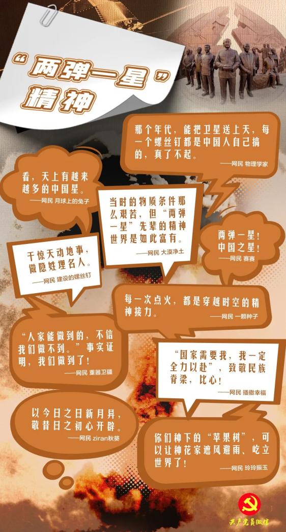 1964年10月16日,我国第一颗原子弹爆炸成功;1967年6月17日,我国第一颗氢弹爆炸成功;1970年4月24日,我国第一颗人造卫星“东方红一号”搭载长征一号运载火箭飞向广袤太空……新中国成立以后,在经济落后、工业和科研基础薄弱,资金、设备极端困难的条件下,一批又一批科技工作者白手起家、不畏艰难、持续接力,攻克了一个个技术难题,创造了令世界瞩目的“两弹一星”伟业,挺起了中华民族的钢铁脊梁。“两弹一星”是不朽的丰碑,以热爱祖国、无私奉献,自力更生、艰苦奋斗,大力协同、勇于攀登为精神内核的“两弹一星”精神更是成为中华民族的宝贵精神财富,鼓舞和激励着代代中华儿女。