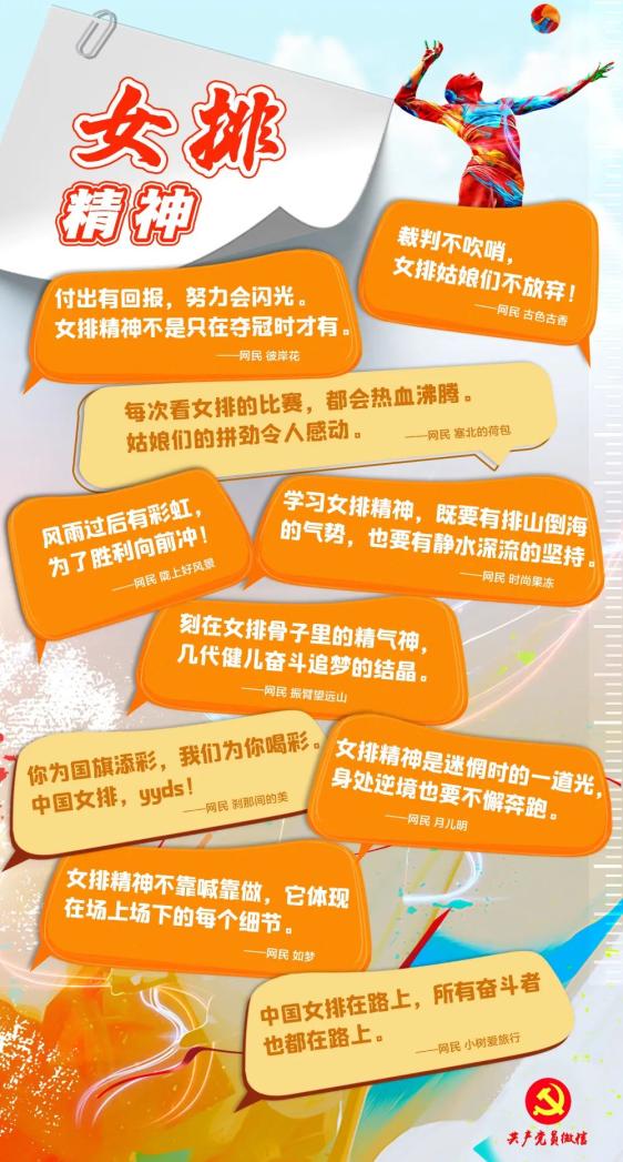 有这样一支运动队伍,让几乎每个中国人都热切关注,提到它,很多人会竖起大拇指,“中国女排,那太厉害了。”与中国女排并列出现最多的是一种影响了几代中国人的精神——女排精神:祖国至上、团结协作、顽强拼搏、永不言败。