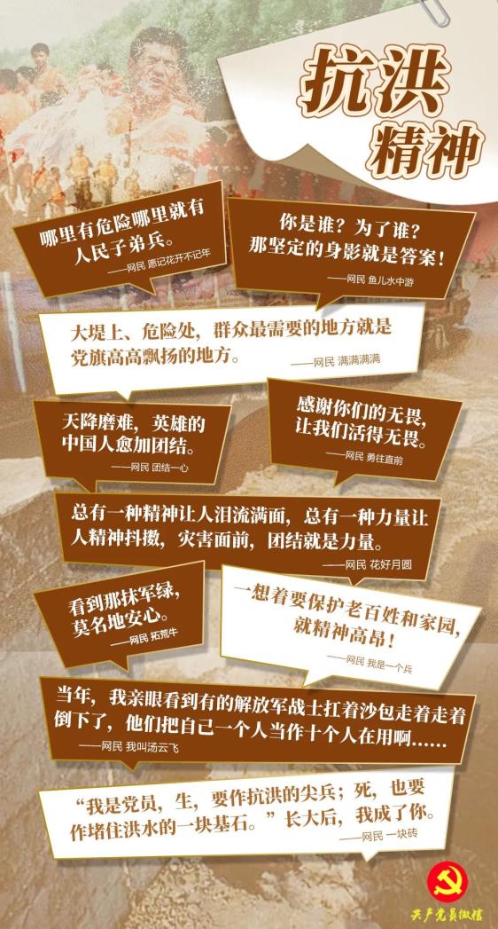 压力和灾难能够催生伟大的品格,锤炼人们的意志和能力。在那一场气壮山河的抗洪抢险斗争中,举国上下齐心协力,凝聚在一起,形成了万众一心、众志成城,不怕困难、顽强拼搏,坚韧不拔、敢于胜利的抗洪精神。历经时间淬炼,抗洪精神已经成为中华民族无比珍贵的精神财富,鼓舞和激励我们克服种种困难,不断取得一个又一个胜利。时间已经证明,有了这种精神形成的雷霆万钧之势,面对洪灾,“洪水涨一尺,我们斗志高一丈”;永葆这种精神,我们一定会像战胜凶猛的洪水一样,克服一切艰难险阻!