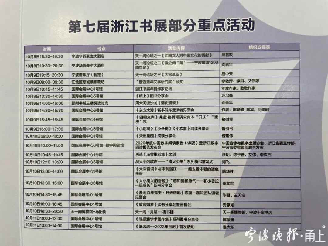 书展期间,爱不孤“读”——书香“甬”动大凉山公益活动,2021城市萤火虫换书大会,“唐弢青年文学研究奖”颁奖,由大型音乐朗诵会、天一阁·月湖“夜书肆”、“席地而坐”系列读书沙龙组成的书展之夜,宁波红人堂新书推荐等活动也将持续展开。