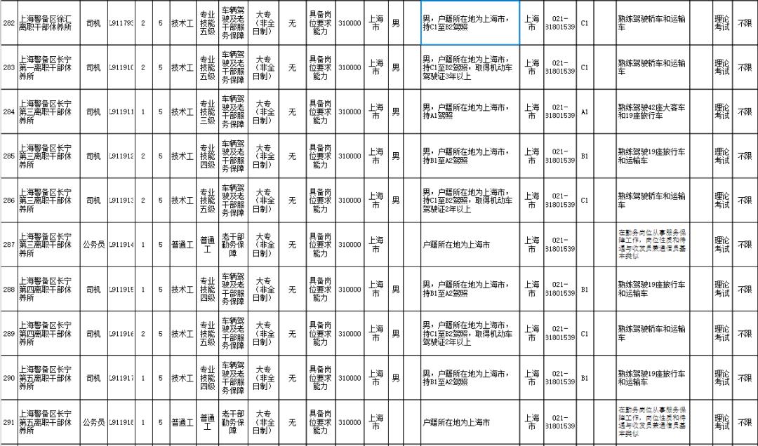 上海警备区直属单位和所属老干部服务保障机构专业技能文职人员岗位,包括司机、公务员、收发员兼通讯员、教练班长(此处所称公务员指在军队勤务岗位从事服务保障工作的文职人员,待遇与收发员兼通信员基本相同)。