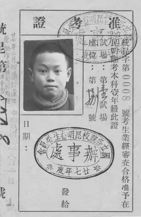 1938年,杨振宁先生参加西南联大招生考试的准考证