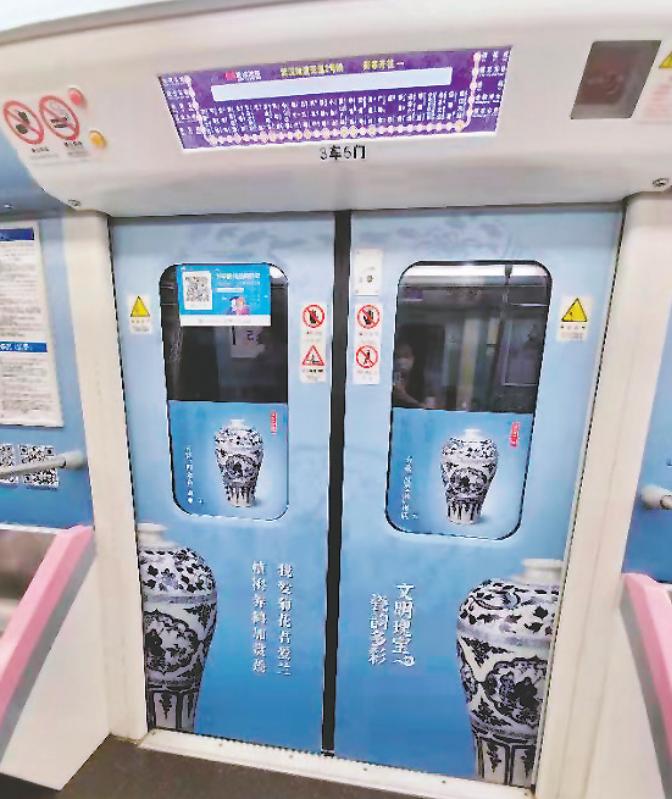 武汉博物馆将馆藏瓷器、玉器、青铜器、古代书画等精品文物,用精美的图片和简洁、生动的文字,根据不同车厢的主题进行布置,营造出传统文化的艺术氛围,力求使乘客能够浸润在琳琅满目的文物精品世界中,感受文物之美,体会传统文化的深刻内涵。