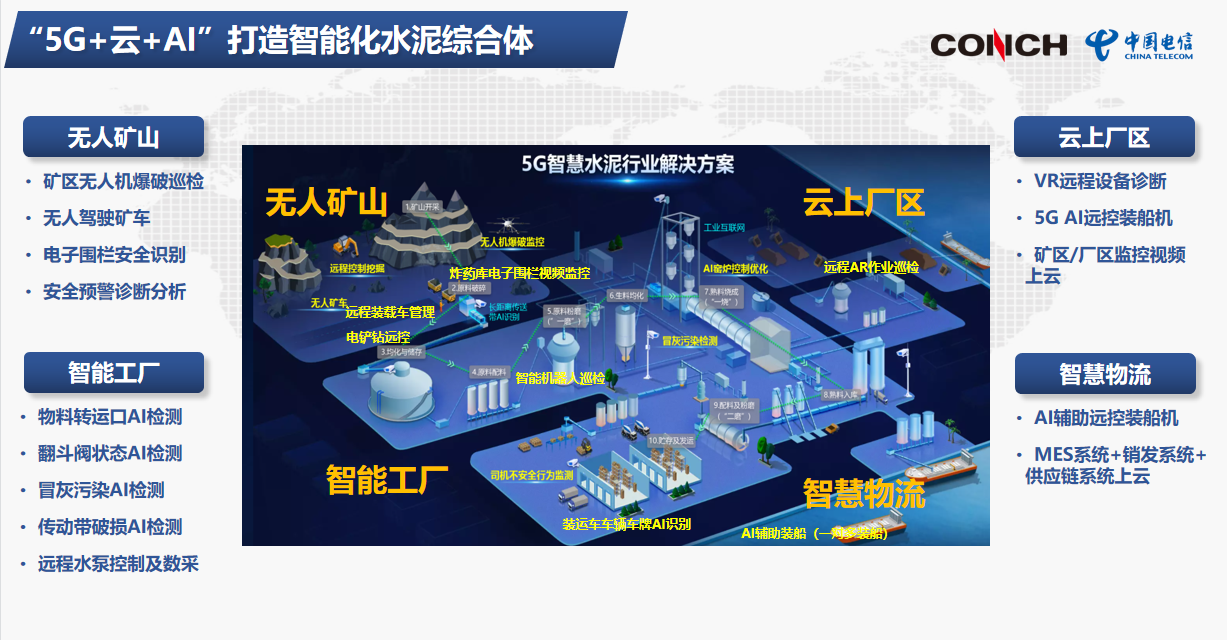 目前,中国电信与水泥行业已全面开展合作,打造了多个水泥行业5G+工业互联网经典案例。中国电信以“端+网+云+用”为核心体系,融入5G、AI、云、MEC等ICT技术,助力海螺集团数字化、智能化转型,在流程制造行业中打造5G智慧水泥综合体,实现芜湖海螺矿山、厂区以及码头的5G覆盖及智能化应用。中国电信和海螺水泥的项目合作优势,是将监控平台、AI分析平台等部署在天翼云上,通过互联网连接,支持云服务管理、设备联网、大数据分析等;同时,打造边云协同,依托天翼云+MEC系统融合、视觉AI识别等云化能力,实现水泥能耗优化、无人机AI爆破巡检、装船机辅助系统等业务场景,引领水泥行业发展。
