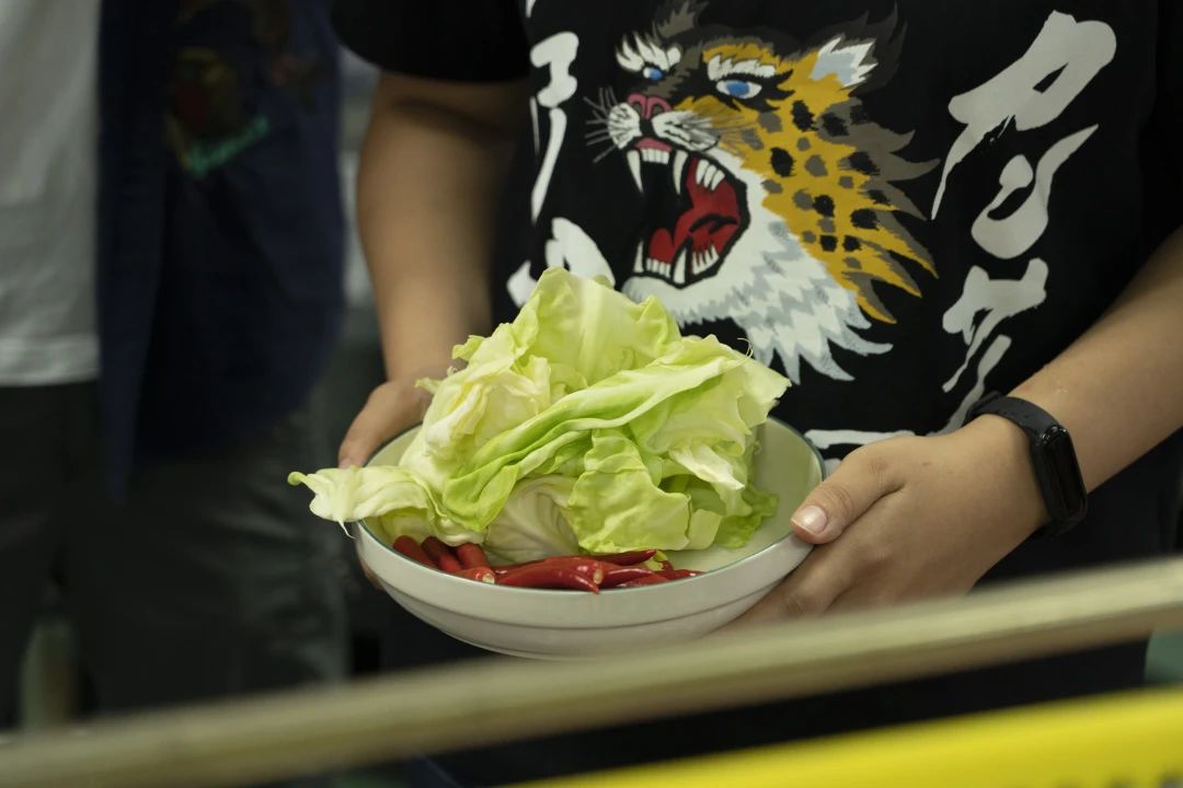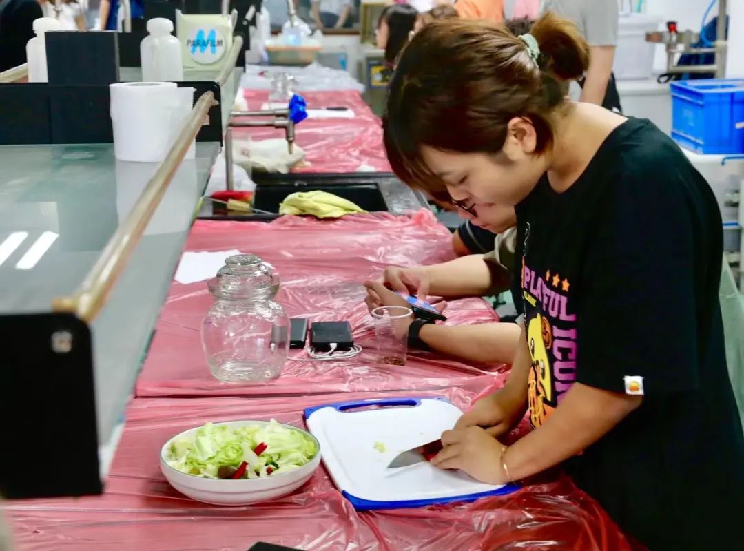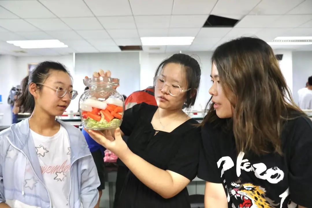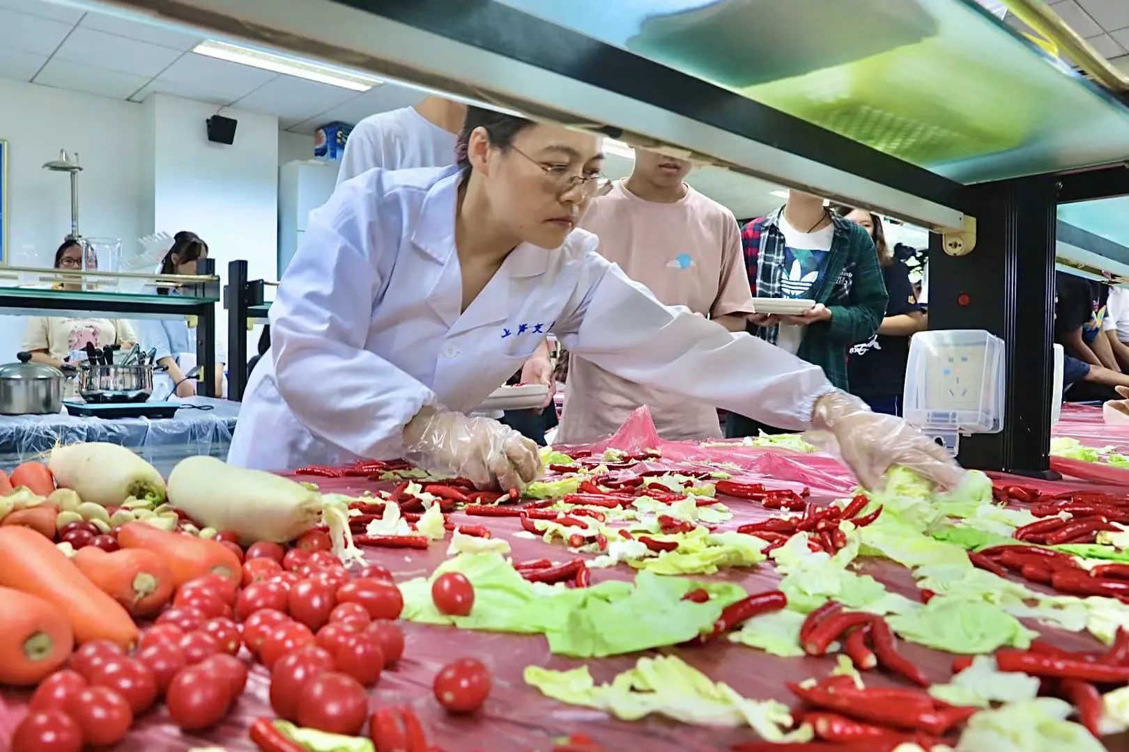 另一组同学则体验腌制传统泡菜。交大“食品工艺学”任课老师吴艳揭秘了其背后的发酵原理及制作关键,向同学们介绍学习食品发酵工艺的理论知识以及泡菜的制作流程。