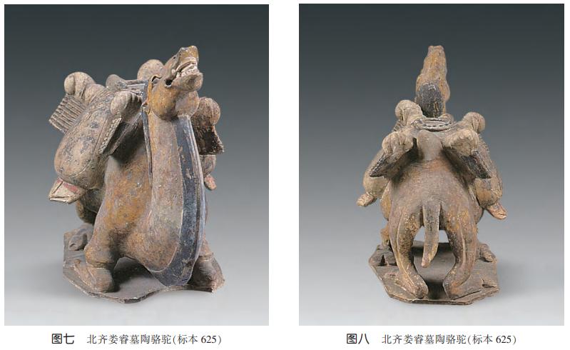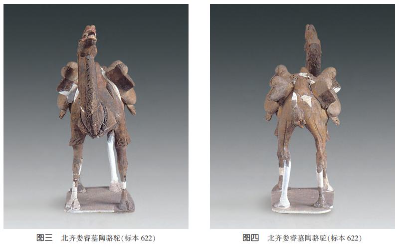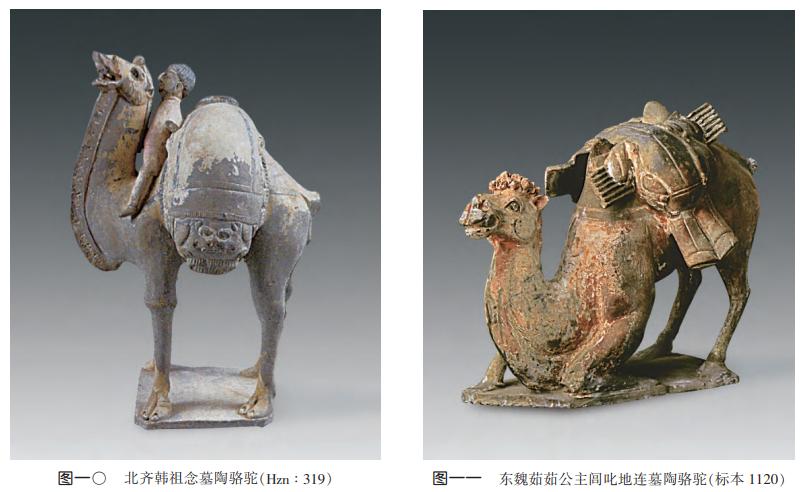 以上墓葬皆发现于晋阳地区,但在邺城地区的东魏—北齐墓中,随葬的陶驼驮载的毡帐之上并没有圆圈形帐顶,例如东魏武定八年(550年)茹茹公主闾叱地连墓(图一一)、北齐武平七年(576年)高润墓和湾漳大墓(图一二、一三)出土标本。