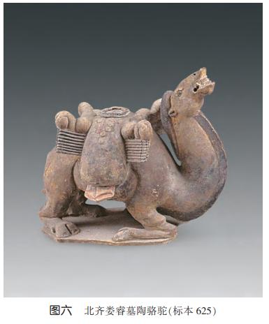 实际情况是,到隋唐时期,埋葬制度发生变化,北朝时的出行仪卫俑群不再流行,随葬的骆驼模型虽然有的仍依北朝传统——驮载帐幕部件,但更多的标本出现新的造型,或背上跨骑有各种人物,甚至载有舞乐队,或驮载各种商品,与行走商路的商队产生关联。但那是后话,按北朝时期的葬俗,墓葬随葬的骆驼模型,应属出行仪卫俑群中的驮载牲畜。