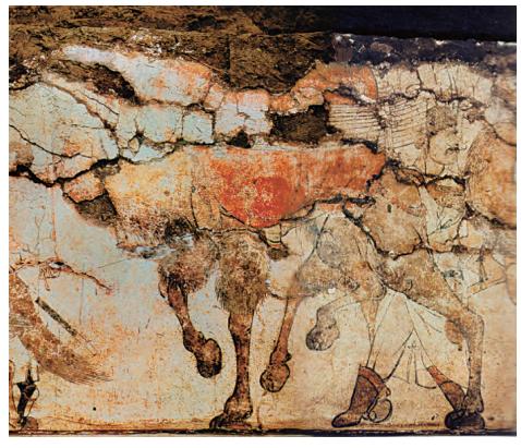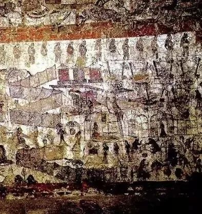 同样在这一时期的墓室壁画中,如北齐娄睿墓墓道两侧所绘出行和归来的队列的队尾,也都绘有背负帐幕的骆驼图像(图一六)。
