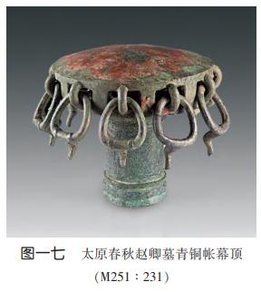 在东周墓的出土遗物中,有青铜的帐顶,如山西太原春秋晋国赵卿墓和河北平山战国中山王陵中所见,形制大致相同。赵卿墓出土标本,通高17.6厘米,下面是圆筒状柱銎,上面是圆顶,圆顶周围设11个用于系结帐幕牵索的扁环(图一七)。圆顶直径18厘米,柱銎直径7.6厘米,说明在帐幕中央立有直径略小于7.6厘米、顶端可纳入銎内的立柱,形同当时殿堂建筑的都柱。这类帐幕张设起来后,周边没有直立的围墙,整体大致呈覆钵形,供行军作战中临时宿营之用,不宜用于长期生活居住。