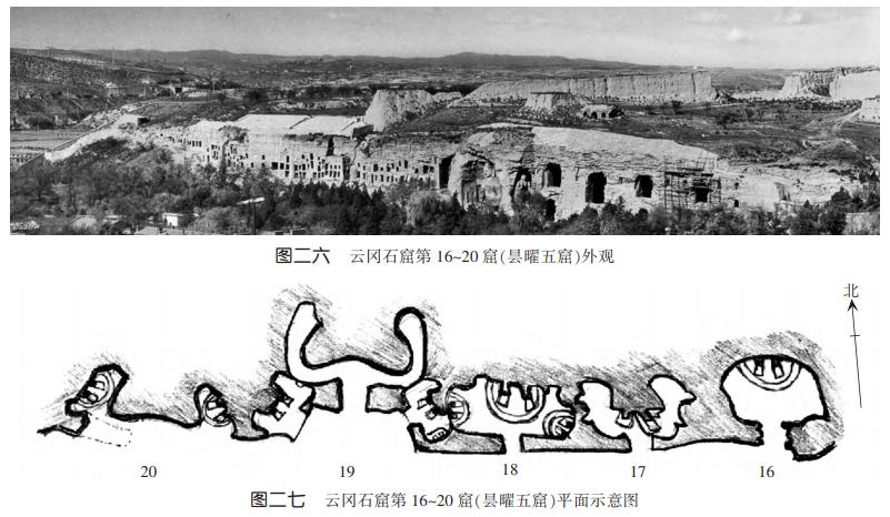 昙曜主持开凿的五座石窟,应即今山西大同云冈石窟的第16~20窟(图二六)。这5座大形石窟,平面均为椭圆形(或称马蹄形)(图二七),顶为穹隆顶。它们依次布列在云冈石窟区的中部偏西处,多在窟内雕造三佛,正壁主像形体巨大,高13.5~16.8米,两侧雕像形体较小,更显主像高大雄伟(图二八)。