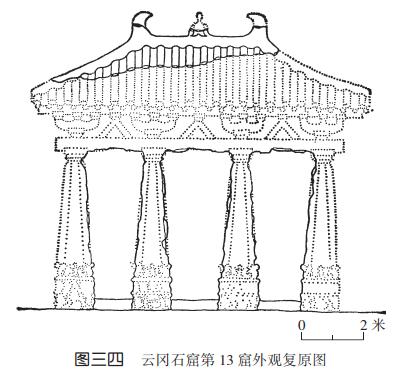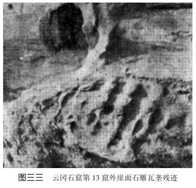1972~1974年,为配合云冈石窟修缮工作,曾对第9~13窟前的基岩面等处进行过清理。在清除第13窟前室顶板积土后,发现了原来雕刻的脊饰、瓦垄残迹(图三三),再结合下方的列柱来看,全窟原来外貌应是雕成具有瓦顶的四柱三开间的佛殿前廊(图三四),顶部为筒板瓦庑殿顶,正脊长约3.6米,距地面9米,脊两端有鸱尾残迹,中央有鸟形残迹;下部为四柱三开间,柱高3.4米,断面八角形,柱基座高1.5米。柱檐风化剥蚀,轮廓处不清,但从前室侧壁和柱头内侧浮雕还可推测,该窟前壁面是柱头刻皿板,栌斗上托额枋,柱头一斗三升,补间人字拱的式样。其外貌正与第12窟内前室东壁所雕殿堂形貌的佛龛相同(图三五)。