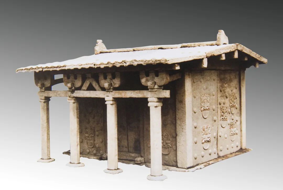 这类前有四柱三开间前廊的殿堂,应是当年流行的建筑样式,也为当时墓葬中新兴的殿堂形貌石棺所效仿,最典型的考古标本就是大同出土的北魏太和元年(477年)宋绍祖墓石棺,它显示出这类殿堂的立体形貌(图三六~三八)。