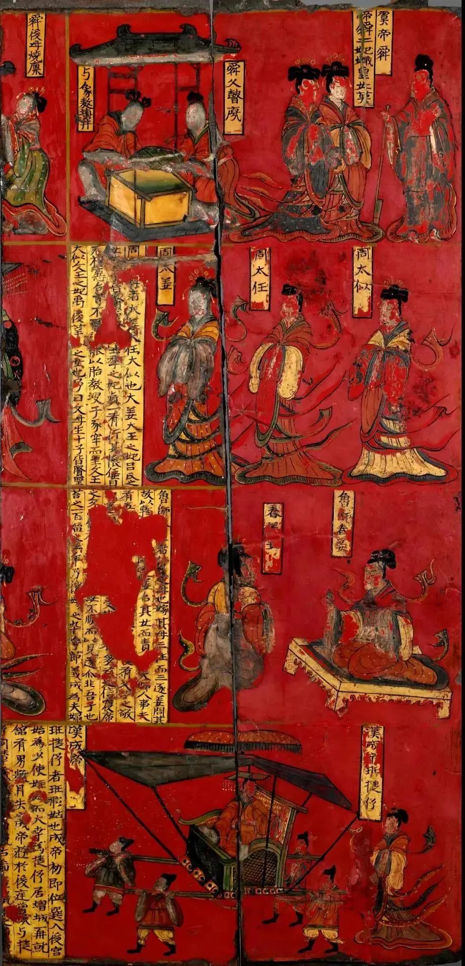 漆画中,人物的面相、体态、服饰,都与传世东晋画家顾恺之绘画的后世摹本中的人物相似,面容清秀而衣裾宽博,女像衣带飘飞,男像褒衣博带、高冠大履,明显是受到当时江南绘画艺术新风熏陶的作品(图四一)。司马金龙家族本是东晋皇族,于刘宋政权建立之初逃亡北地,故能在北魏急于获取南方画艺新风时将其介绍到北方。