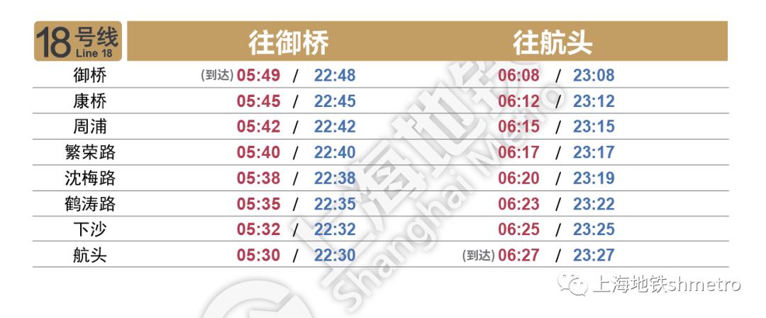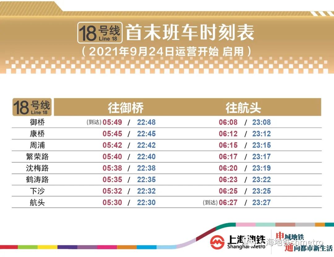 小布从上海地铁获悉,自2021年9月24日起,上海地铁18号线(航头~御桥)首末班车时间将调整:首班车提前,末班车延后。18号线整体运营时间有所延长。同时,部分区段高峰运营间隔也将缩短。