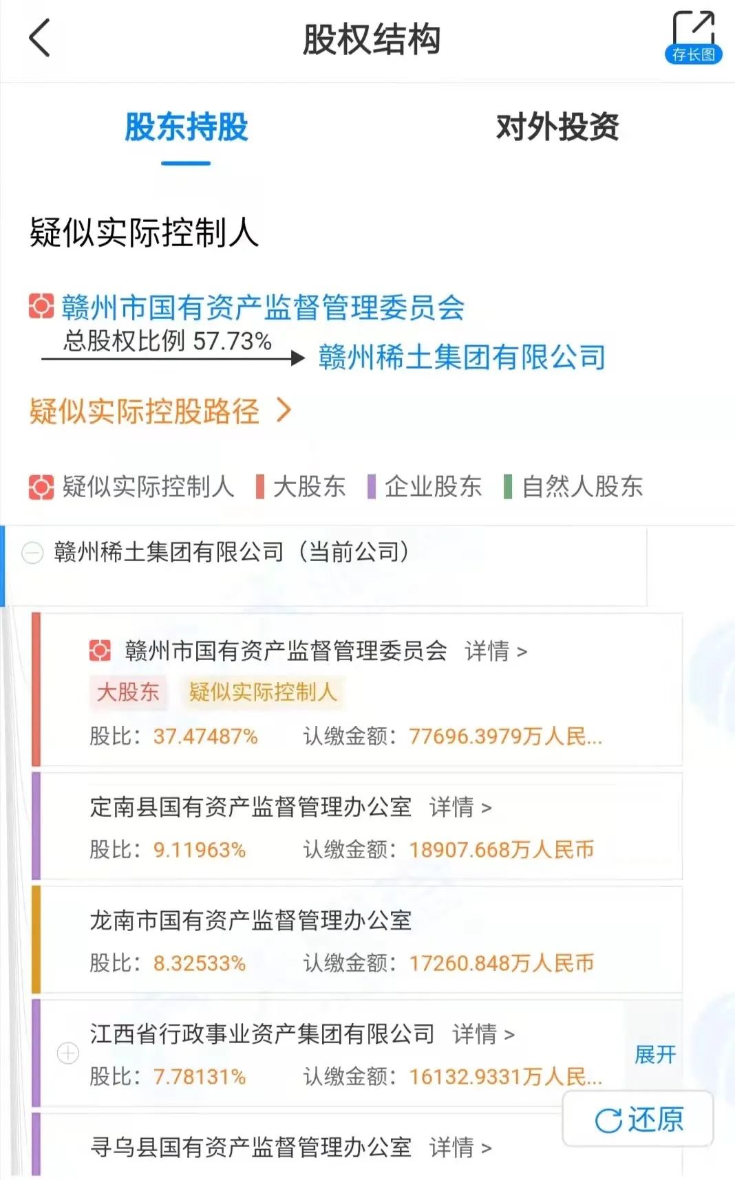 目前中国有六大稀土集团,包括中铝公司、中国北方稀土、厦门钨业、中国五矿、广东稀土产业集团、中国南方稀土集团。中国南方稀土集团正是来自赣州,为赣州稀土集团绝对控股公司(持股比例94.5%),后者最大股东则是代表赣州市人民政府的赣州市国资委,其余股东还包括江西省行政事业资产集团及赣州下辖八个区县的国资局。