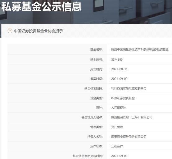 今年9月9日,全球量化投资巨头Two Sigma旗下的腾胜投资在基金业协会备案了第二只私募基金产品——腾胜中国瀚量多元资产1号私募证券投资基金,引发市场关注。