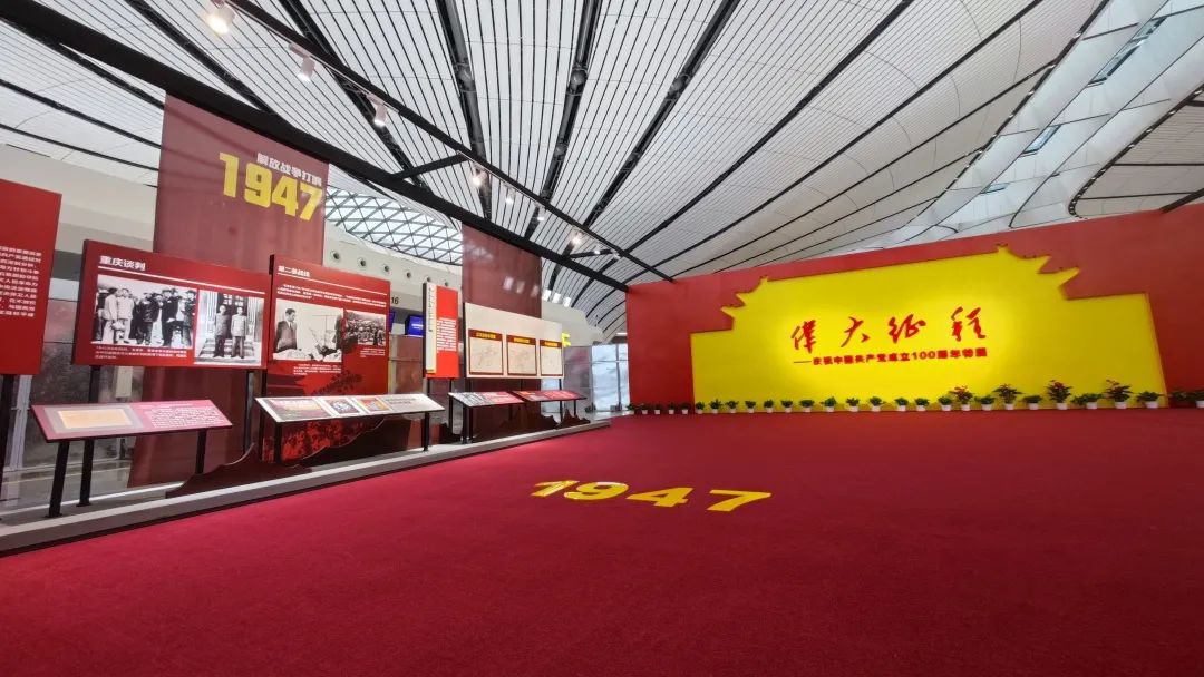 值机岛E岛与F岛之间,有机场为庆祝中国共产党成立100周年举办的“伟大征程”主题展览。特展通过历史影像展示中国共产党从建党到建立新中国的革命历程,带你回顾百年峥嵘岁月,穿越百年历史时空。