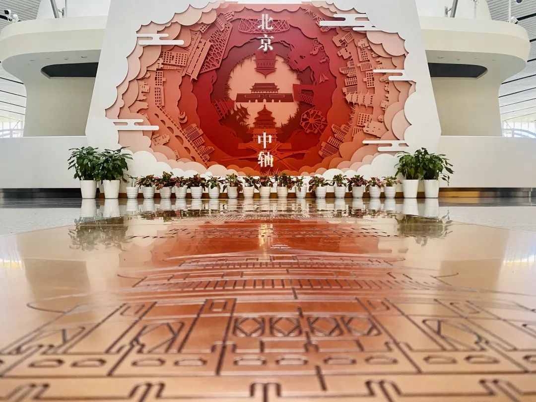 同在四层的,还有E岛背后的“一城一线一世界”景观。景观位于北京中轴线上,由10块0.9米见方的铜方砖组成,依次再现北京中轴线上的经典景观——国家体育场、鼓楼、景山、天安门、大兴机场等。踏过每一块方砖,感受这一刻你与北京的紧密串联。