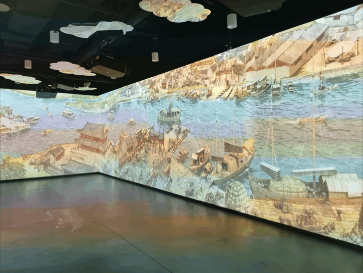 来到航站楼二层,“光影之旅”数字体验馆为你精心打造了一个艺术世界!展厅展示的是由首都博物馆、中国大百科全书出版社合作的百科全书式历史长卷数字影像展,以“穿越时空的大运河”为主题,在原创百科全书式手绘历史长卷的基础上开发制作,实现了三维动画与二维场景的完美融合,其中动画人物1700余个,大小船只200余艘,蔚为大观。在这里,你可以获得沉浸式的艺术体验,仿佛穿越2500年的历史时空,看到明代通州漕运的繁忙景象。本次更新的光影展即将试展,更多精彩等你来大兴机场现场感受吧!