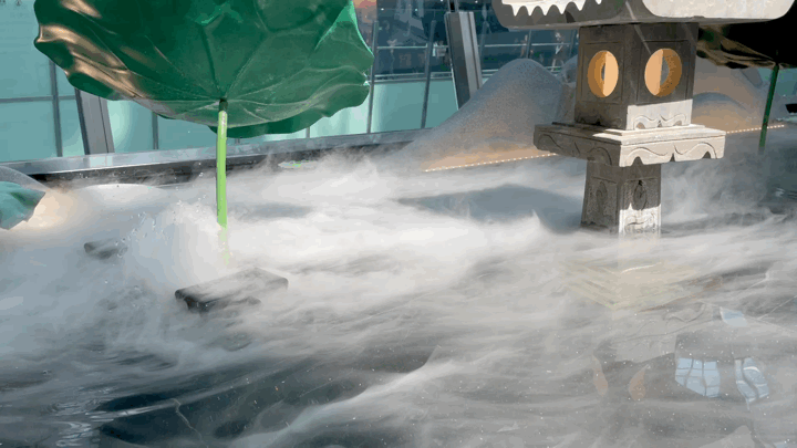 转身来看月牙池的对面!北宋画家王诜所绘的设色绢本山水中国画《渔村小雪图》被搭建还原。松柏与山石置前,画卷中的美丽景致向外延展,让这幅真迹现藏于故宫博物院的作品,在你的面前立体呈现。