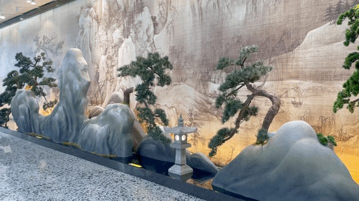 A指廊尽端的丝园通过汉白玉铺地、墨色池水、浓绿刚竹打造了一处丝竹雅境。洁白丝绸飘落庭院,翠色竹林葱茂相伴。在候机的短暂时刻置身其间,让你在丝与竹的环绕中,感受中国文化的气质内蕴。