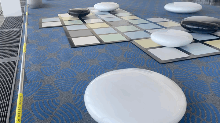 C54登机口东侧的《弈趣》以围棋的棋盘为造型,棋子座椅表面采用触碰感应面层材料,将艺术化与功能化设施合二为一。置身棋盘选择一子坐下,让你在休息中感受蕴含在围棋中的中华文化丰富内涵。