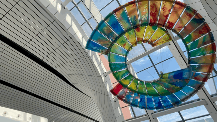 《二十四节气》位于C指廊尽端,它是将二十四节气用艺术玻璃组成的一件悬挂式抽象雕塑。多种渐变的颜色、多个角度的光照、多条连续的曲线,让你在欣赏中直观感受二十四节气的交替变化。