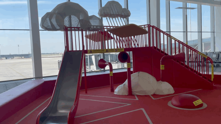 位于A10登机口东侧的《听,天空中的感动》为孩子们打造一处乐园。带翅膀和云朵的滑梯、蹦丘与喇叭,让乘机的孩子们在游戏中体验遨游天空的快乐。景观中家长看护陪同座椅的设计,也为这份快乐加注了更多的安全与放心。