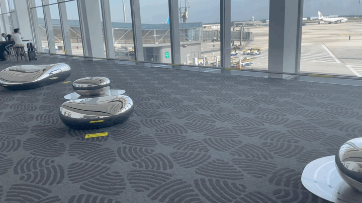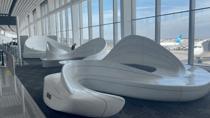 走累了的话就来D61登机口东侧的《行云流水》坐一坐吧!定制纹理在座椅表面起伏变化,似行云流水一般与窗外景色融为一体,让你在这里可以获得身体与心理的深度放松。