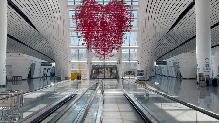 E指廊尽端的心形悬挂装置——《爱》由不同国家“爱”的语言组合而成。精妙的艺术设计与富有情感的深刻含义完美融合,吸引了众多游客的驻足欣赏,也使其成为机场最热门的打卡地之一。