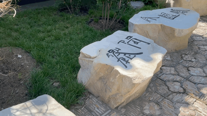 园内石径选用北京房山汉白玉。呈现石凳的样貌,可供人们休憩。石径选用新英文书法撰写南宋朱熹《观书有感》,将整句诗词刻在石材上,将中国传统文化艺术生活与空港功能结合,生动展现丝路新征程。你能看出来这些字是怎么构成的吗?(中国民航报 记者张彤 通讯员哈皓然、陈媛)