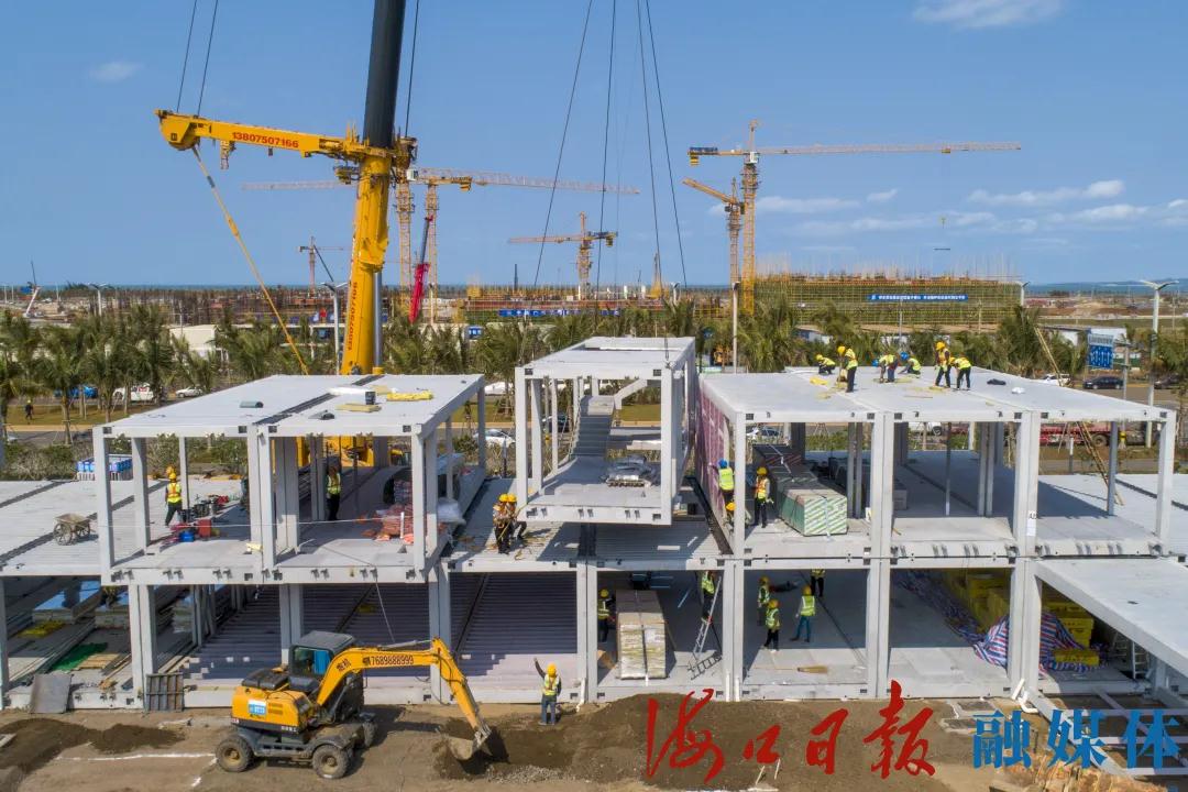 施工方中建科工集团有限公司海南公司负责人介绍,企业港项目采用工厂化制造预制构件、现场机械化安装的方式,通过拼装降低施工噪音扬尘,绿色节能环保,高度契合低碳建造、绿色生态的建筑业发展趋势。项目总建筑面积为2.3万平方米,采用装配式钢结构与集成模块化体系建造技术,从开工到竣工,仅用90天。