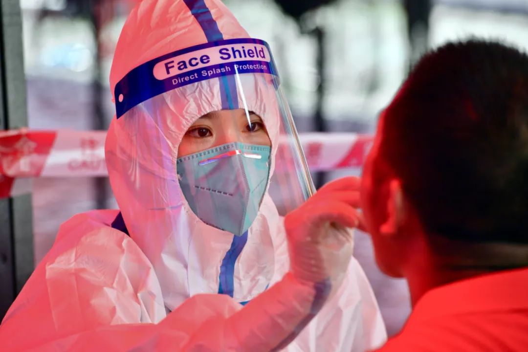 △在厦门思明区一核酸检测点,工作人员在为居民进行核酸取样。新华社记者 姜克红 摄