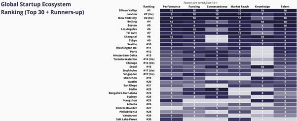 9月23日,美国知名创新政策咨询公司基因创业以及全球创业网络《2021全球创新生态系统报告》于伦敦科技周正式发布。《报告》对全球140多个主要城市创新数据进行分析和比较,美国硅谷排名第一,伦敦和纽约并列第二;北京、上海位列第四和第八,是亚洲排名最靠前的创新生态城市。本次发布的2021创新生态榜前十中,半数来自美国或中国的城市。