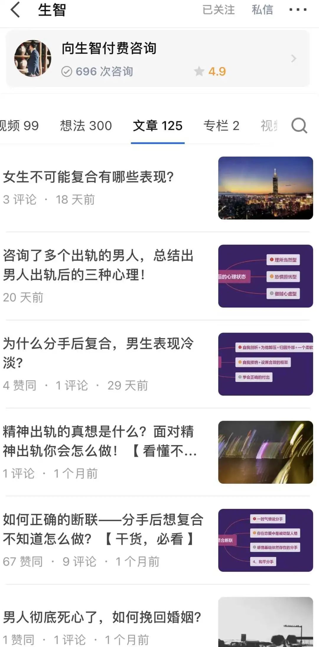 “只要找到他们,按照他们说的来,男友百分百能回来!”一名职业显示为咨询师的“生智老师”抓住了范颖雨的心。“生智”在知乎上的标签是:洞察人性最深处/心理咨询/懂你所经历的,发表了《对方不愿意回信息该如何挽回呀?》《男生提分手后会想复合吗?》《分手后该如何和对方聊天呢?》等多篇与情感挽回相关的文章。