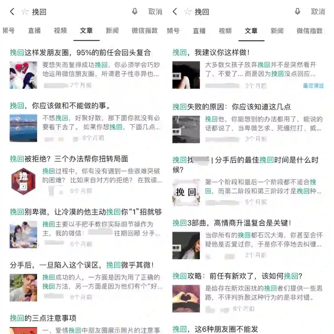 在百度、知乎、豆瓣和微信等平台上 ,一些“情感挽回”的营销推广无孔不入,它们大多隐藏在一篇篇所谓“成功挽回”的故事中,或者一些情感自媒体的分析文章里,总有那么几句话能抓住失恋者的心。